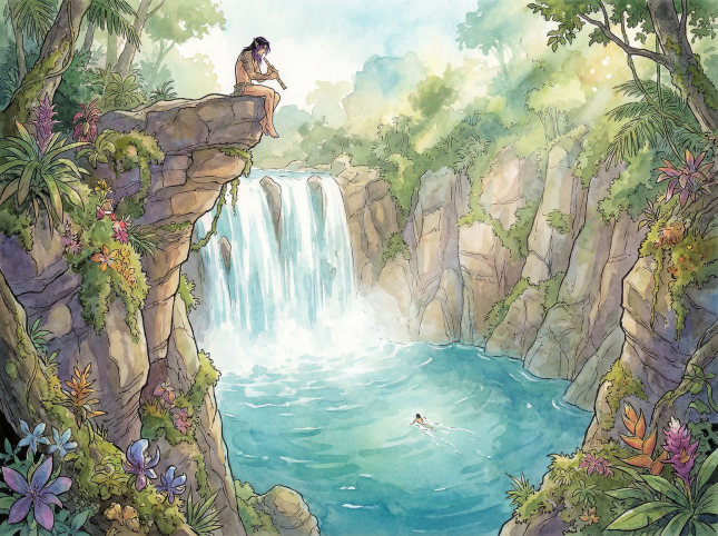 Olox impiegò qualche istante per riprendersi dallo spavento. Nel frattempo aveva perso contatto con l’animale che forse era volato giù per la scarpata. Olox cercò di individuarlo visivamente o uditivamente, ma c’erano due fattori che glielo impedirono. Da un lato l’improvvisa luminosità per essere uscito dal fitto della giungla, dall’altro il rumore di una cascata poco lontana. In fondo alla scarpata, infatti, c’era un laghetto alimentato da una cascata d’acqua. Era un posto incantevole, Olox si sentì felice di esserci capitato, non lo aveva mai visto.